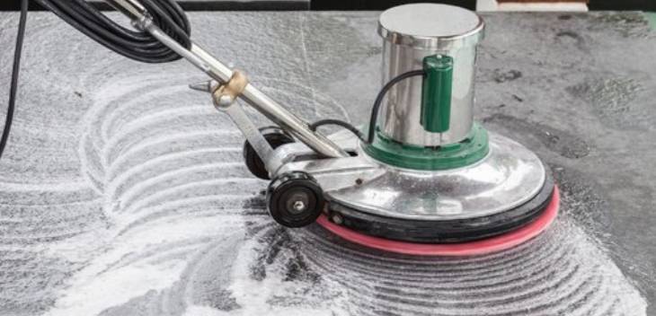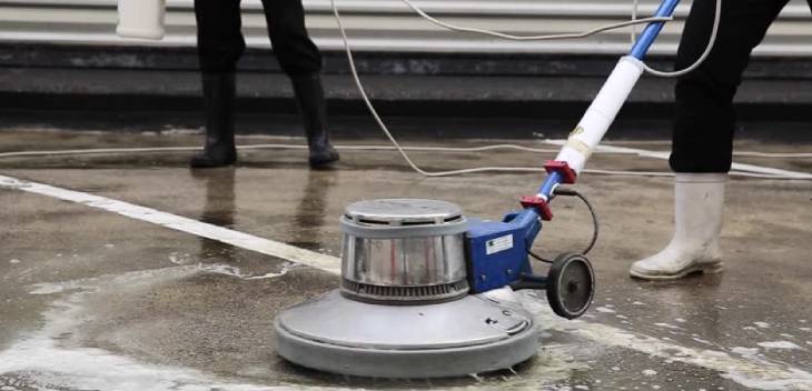 Cleaning of the floor using Single disc scrubbing machine with special detergents and scrubbing pads.